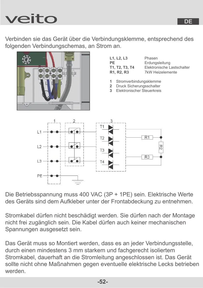 Die Betriebsspannung muss 400 VAC (3P + 1PE) sein. Elektrische Werte