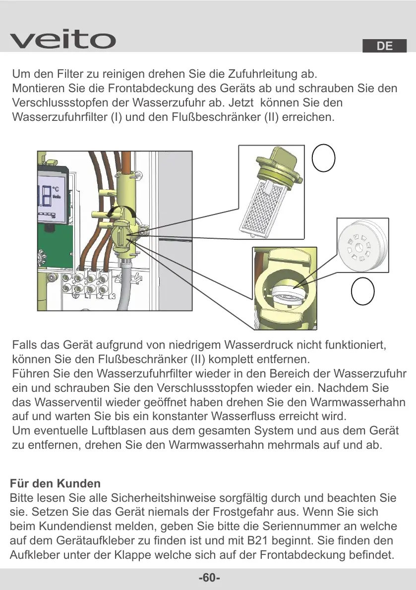 Wasserzufuhrfilter (I) und den Flußbeschränker (II) erreichen.