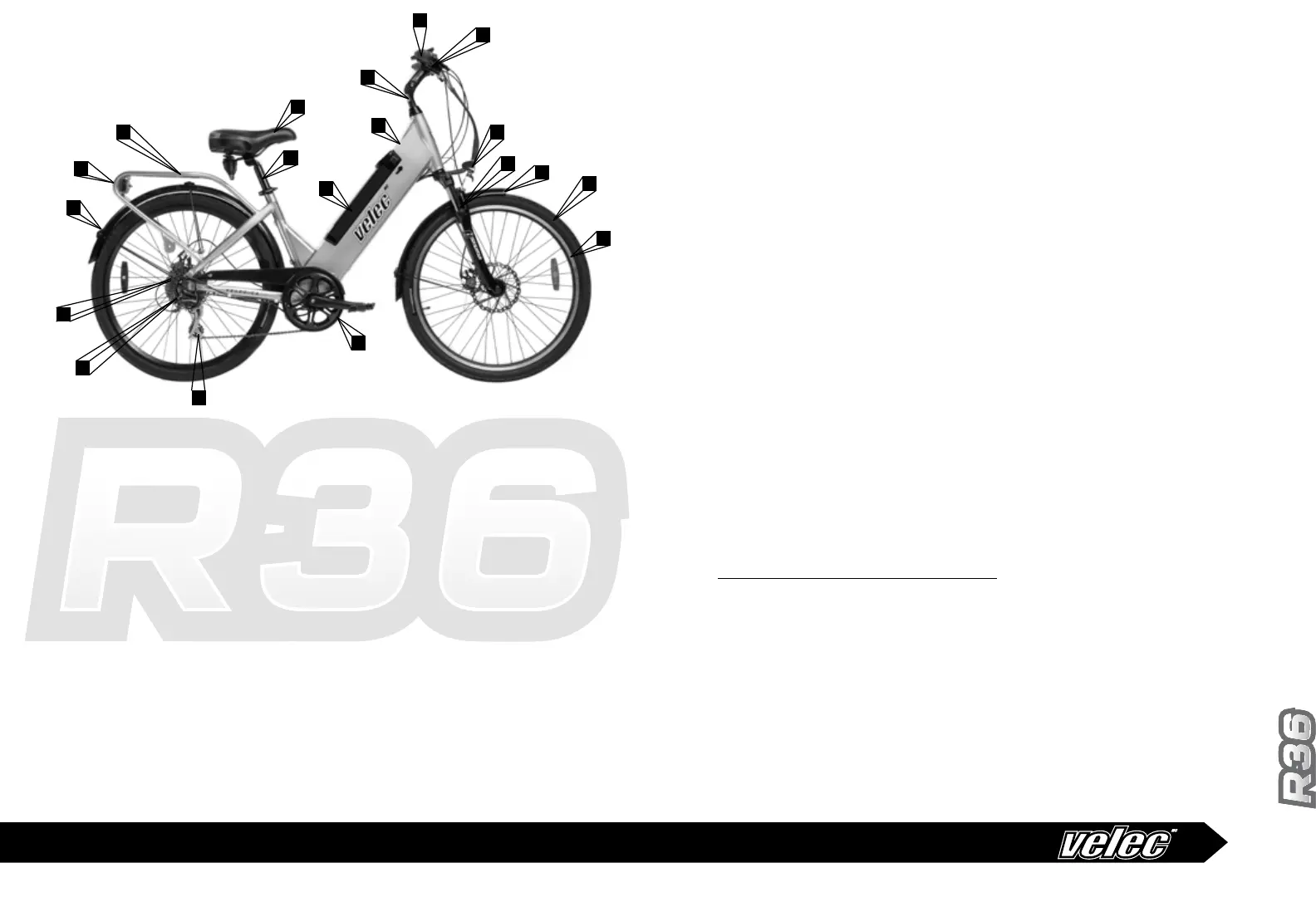 The Velec R36 is a bicycle equipped with a 36V/10Ah, 13Ah or 16Ah battery