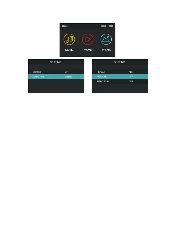 for music & Movie, back ground Music on/off and slide show time settings for Photo).