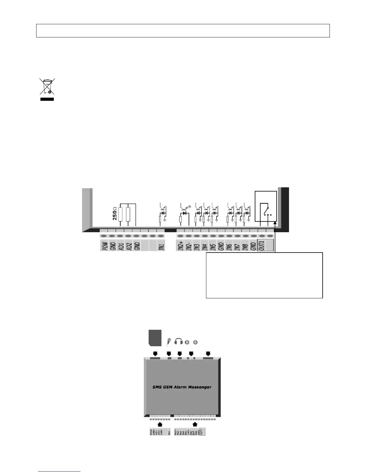 IN1, IN3, IN4, IN5, IN6, IN7, IN8, GND: entrada de alarma 12VCC, 7~15mA, masa común ópticamente aislada