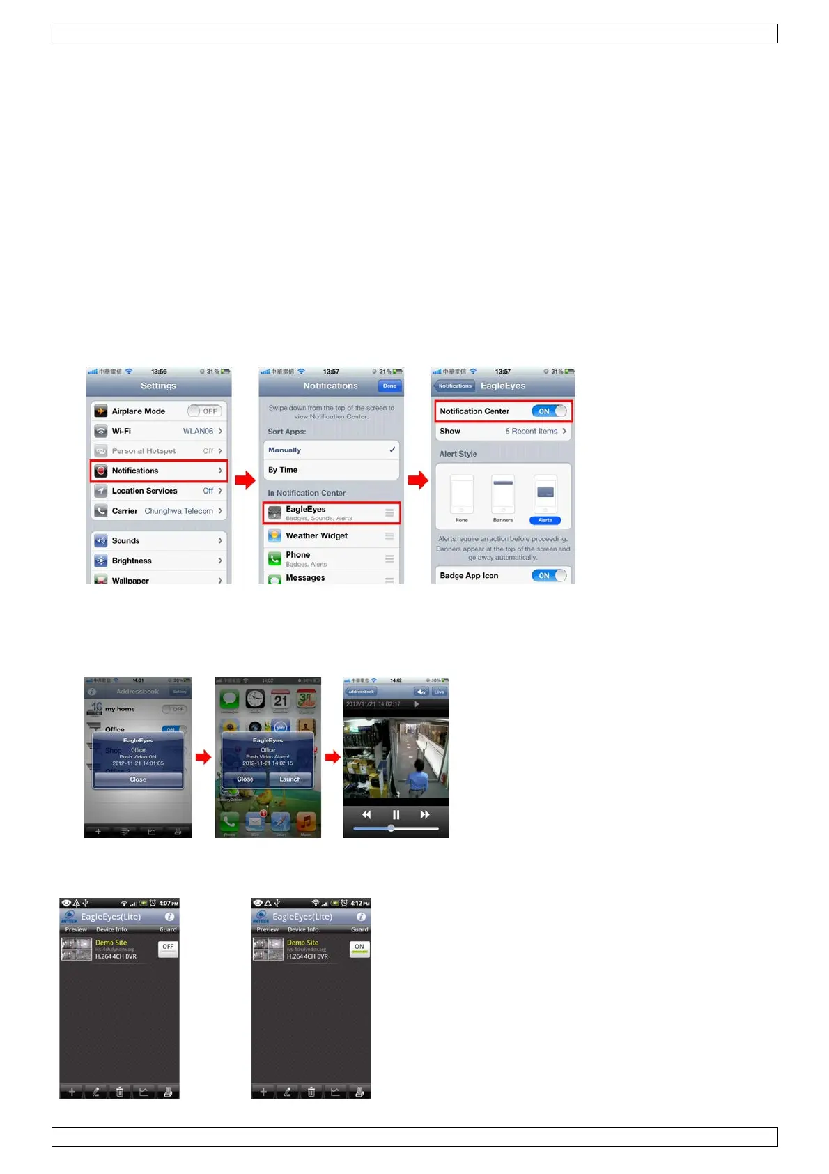 3. Open EagleEyes en zet de Push Video knop op ON. U ontvangt een bericht dat push-bericht (push video)