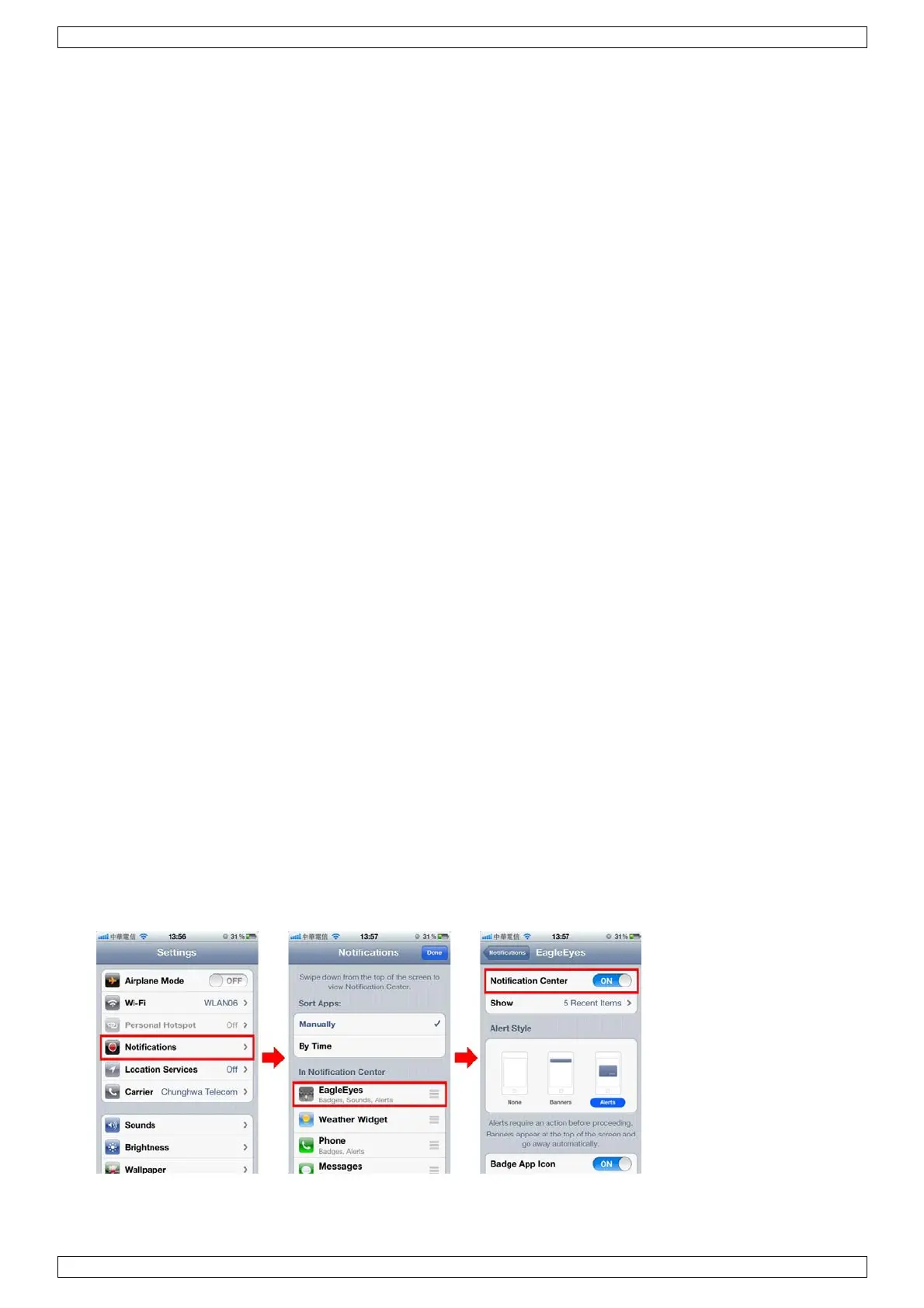2. Sélectionner EagleEyes et s'assurer que Notification Center soit réglé sur ON.