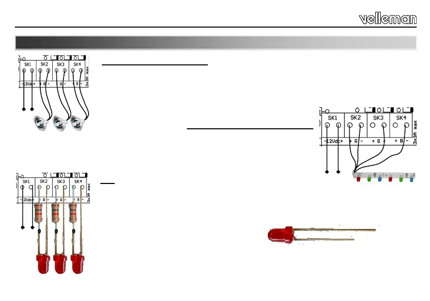 No es importante la polaridad. ¡Ojo!: 3A/canal máx. (36W@12V).