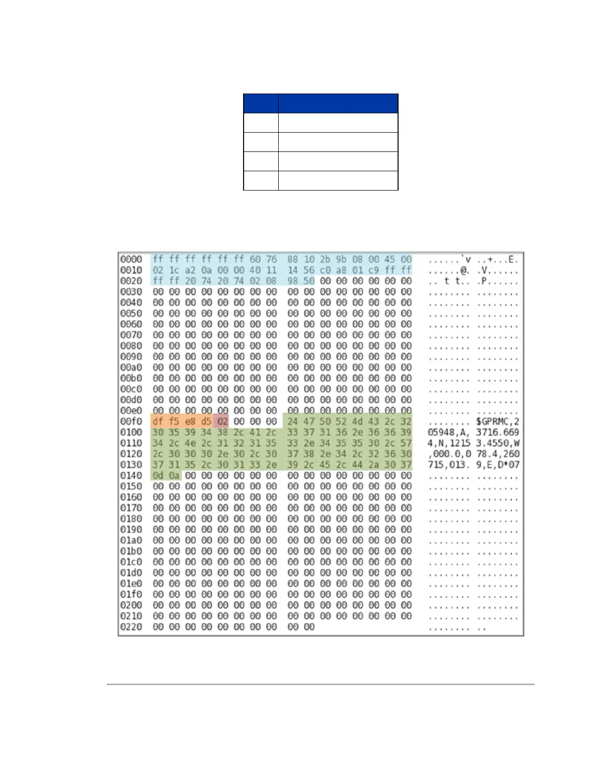 A position packet is shown in the figure below. Packet offsets are on the left, raw data bytes in hex are in the center, and the