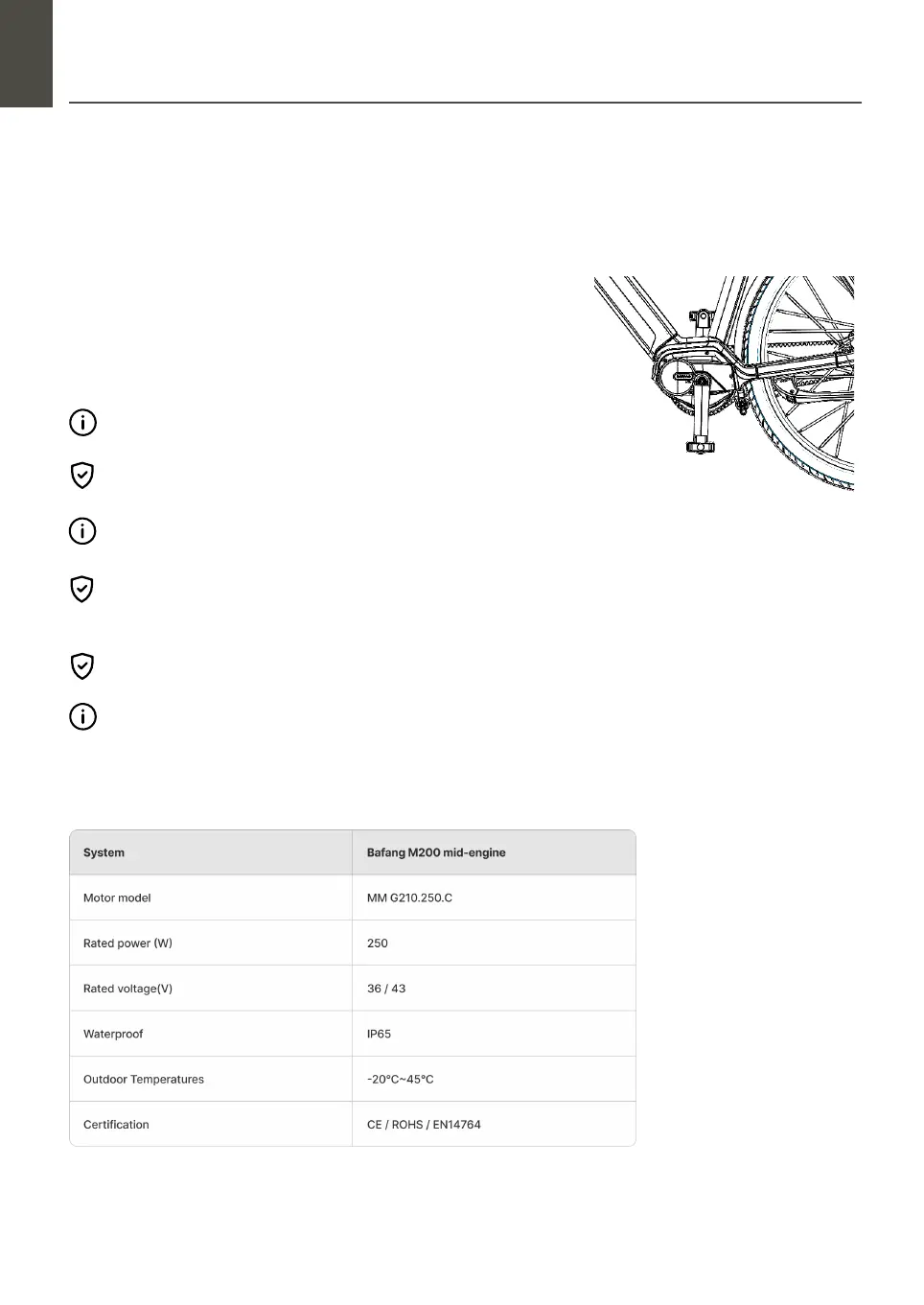 M200 mid-motor is known for its ecient power usage and powerful output of 65 Nm. Your ride will be smooth, silent and very economical.