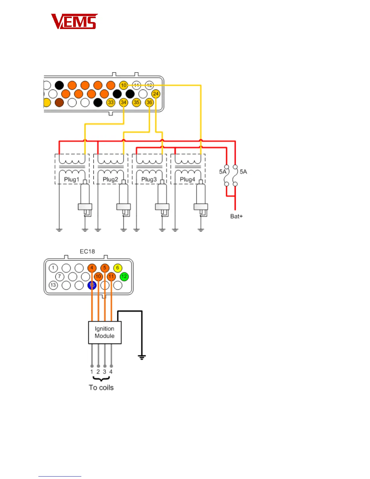 Individual Coil connections are shown, the pins connect to the negative '-' side of the coil.