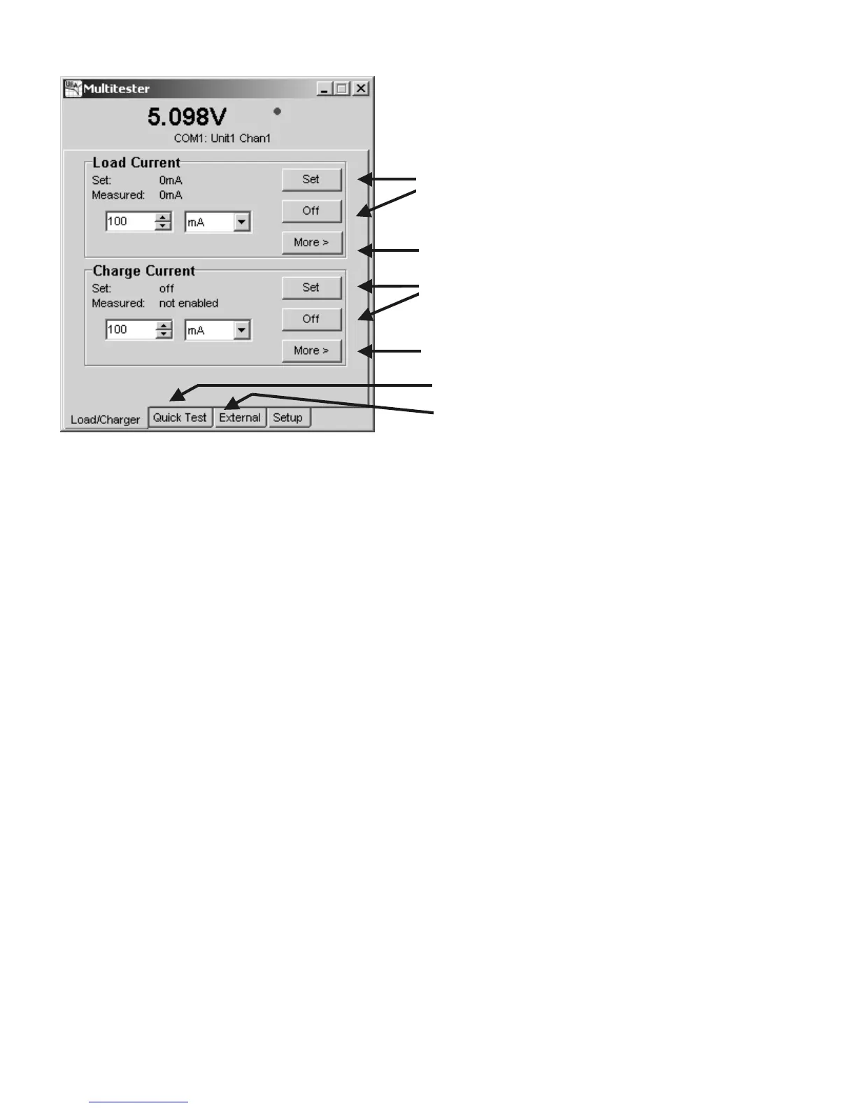 Enter a small test current (100mA for example) into the load or charge current edit boxes and click the corresponding