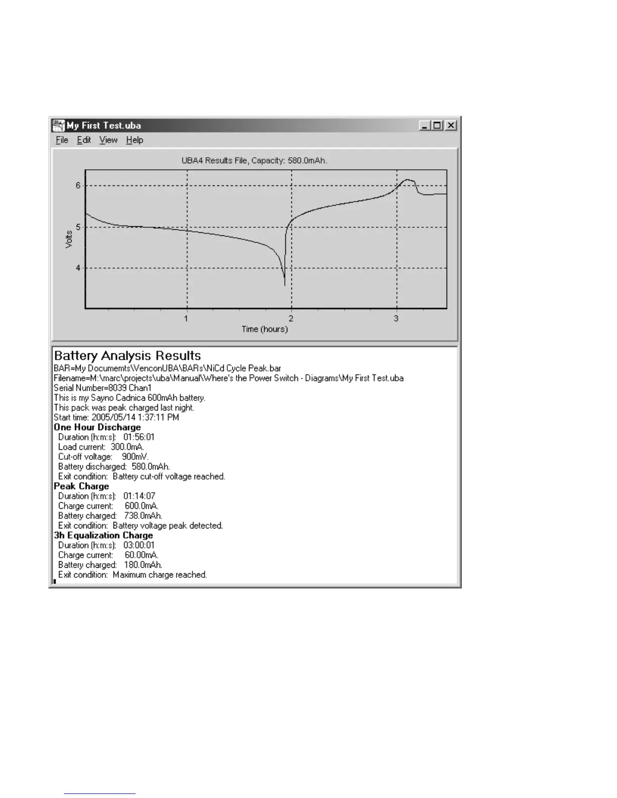the battery must be fully charged before the test. The NiCd and NiMH BARs that come with UBA Console run for two
