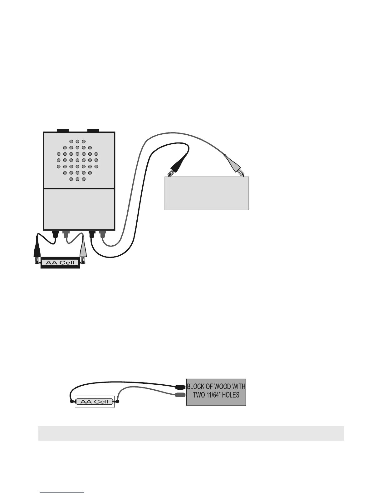 lab banana plugs connected to a battery, when not connected to a UBA, are inserted into a piece of wood with 11/64”