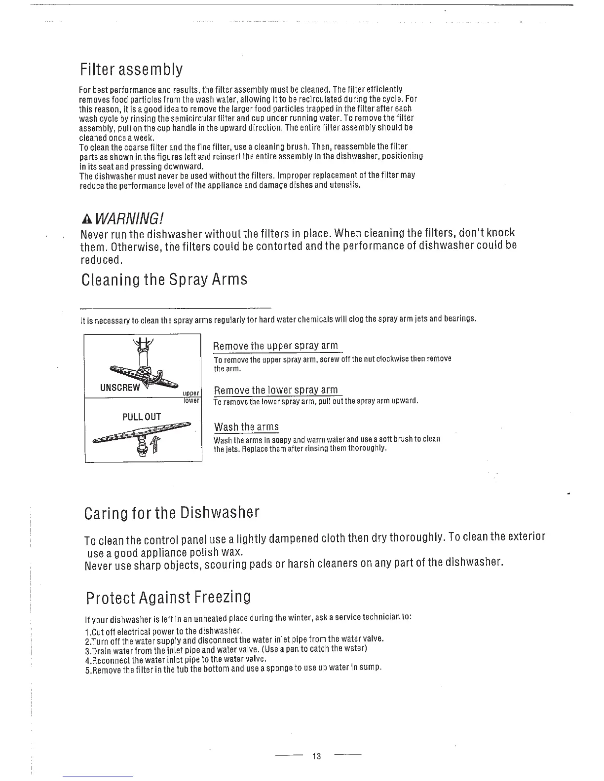 Veneto CSDW60SS - Filter assembly; Cleaning the Spray Arms; Caring for the Dishwasher; Protect Against Freezing