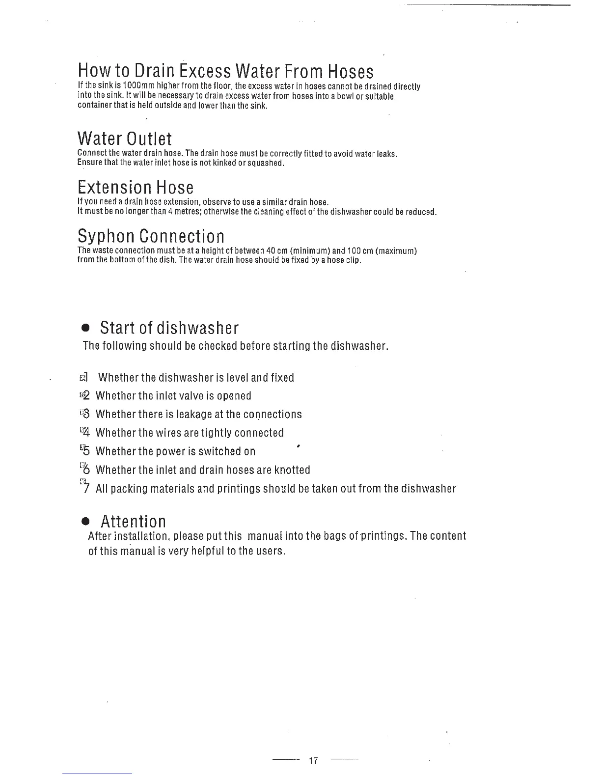 Veneto CSDW60SS - Positioning the Appliance; How to Drain Excess Water From Hoses; Water Outlet; Extension Hose