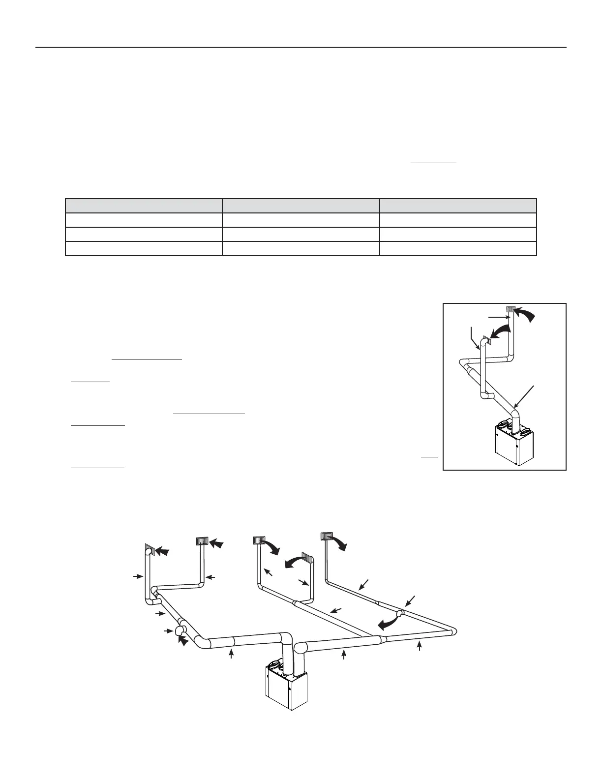 Main duct: Table indicates for a 6” Ø duct: recommended air flow: 120 cfm, maximum air flow:
