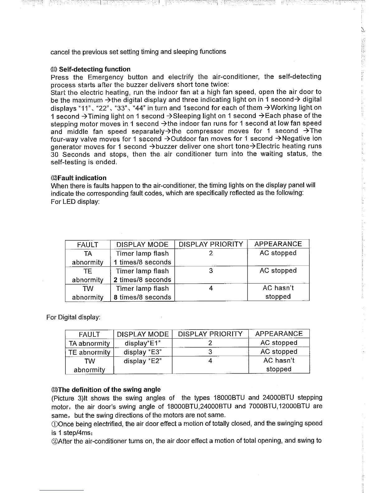 Venting HP18RA - Self-Diagnosis & Faults (18-24 k BTU); Self-Detecting Function; Fault Indication; Swing Angle Definition