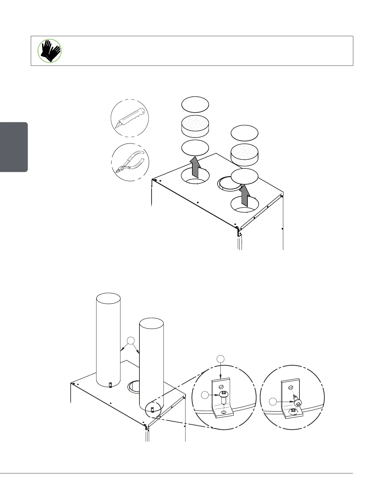 A) Remove the knockouts that close the 8" (20 cm) diameter holes on top of the fireplace. Then cut