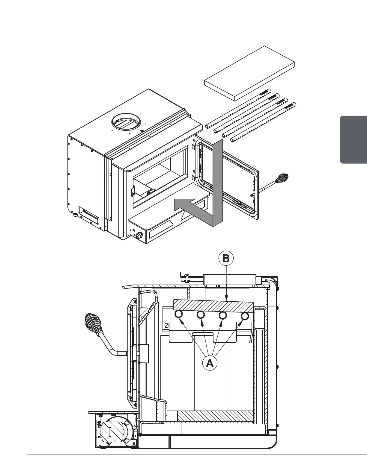 Note that secondary air tubes (A) can be replaced without removing the baffle board (B) and that