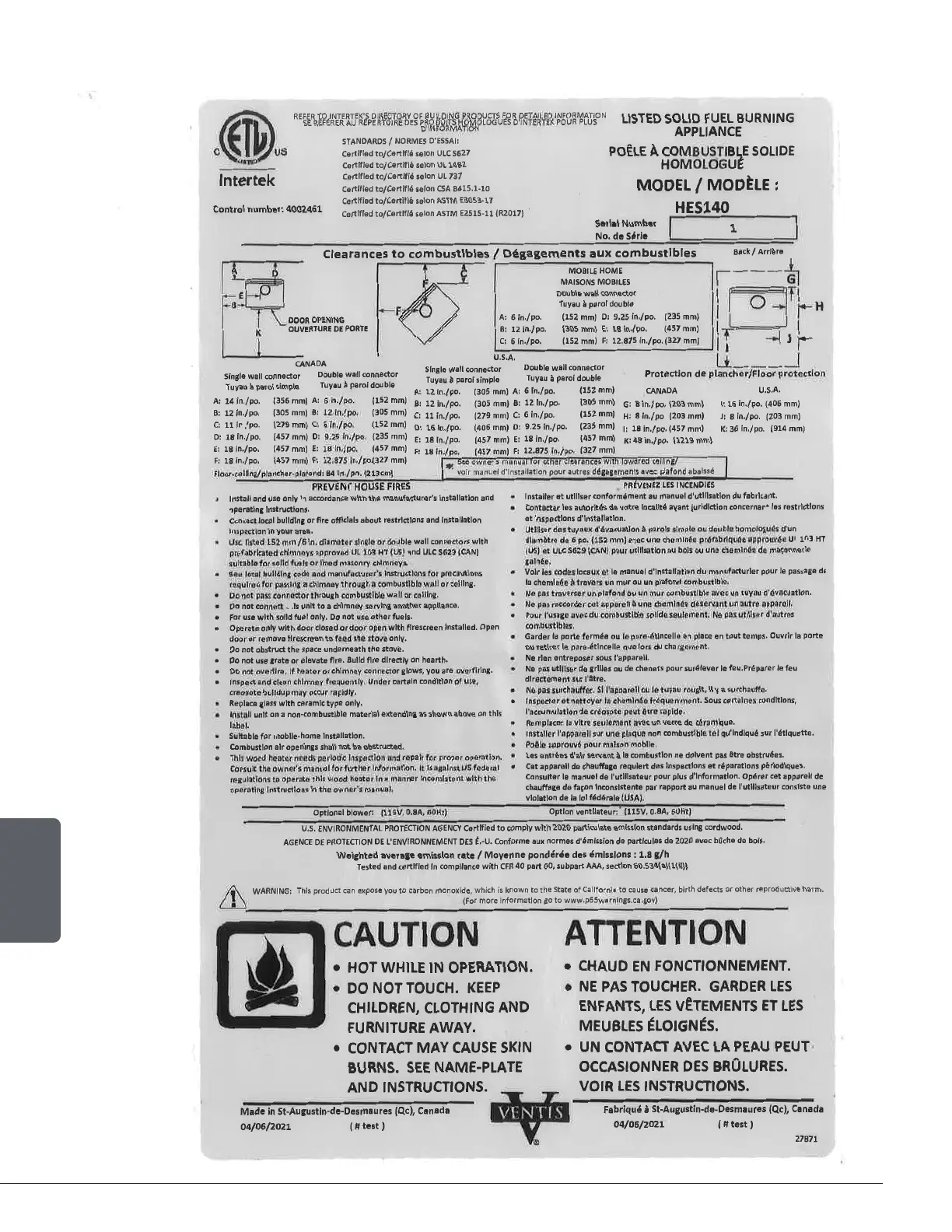 Ventis HES140 - Certification Plate and Standards