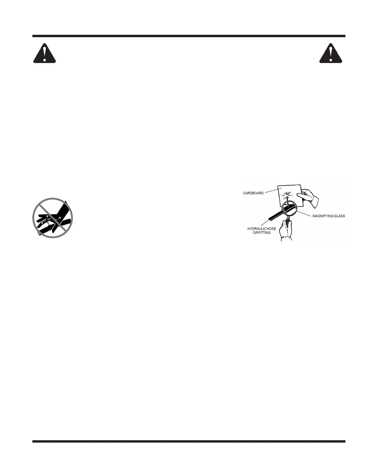 • Hydraulic leaks can occur under high pressure. Hydraulic leaks require special care and attention.