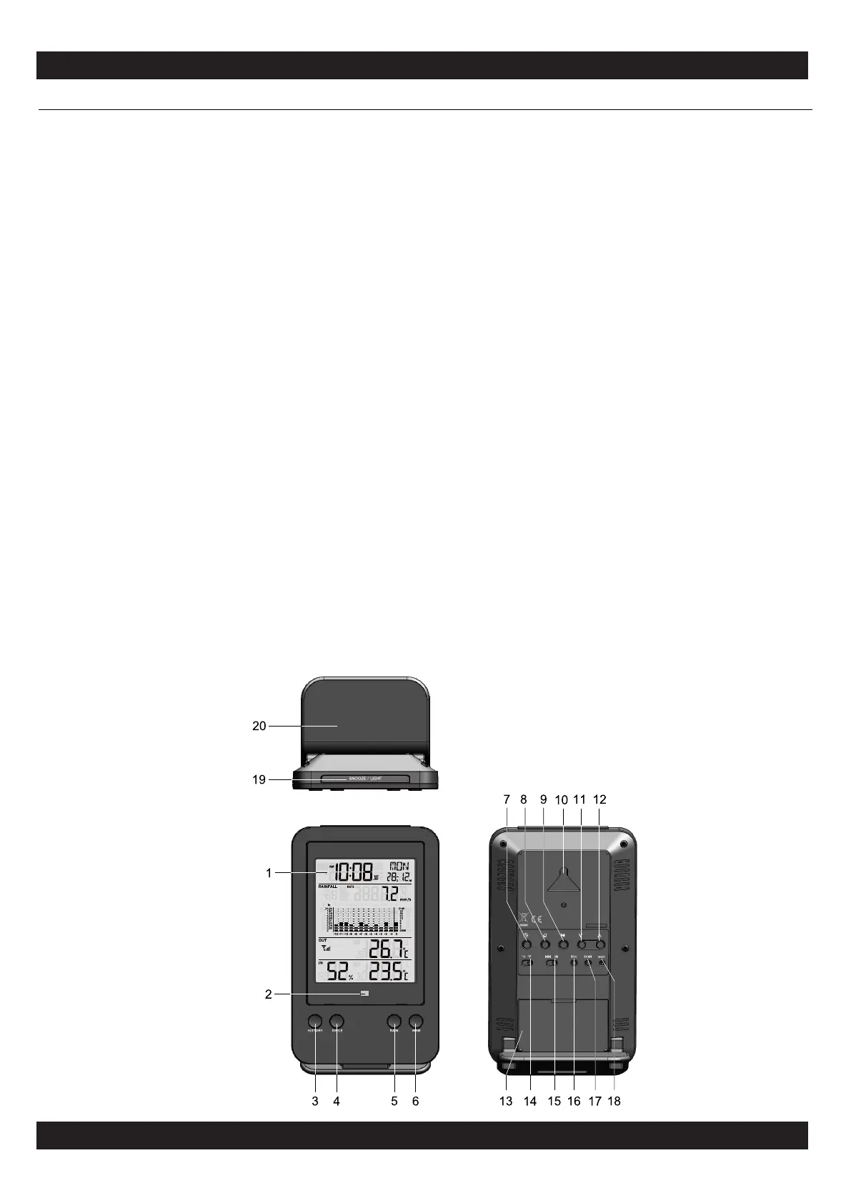 1. LCD-skärm: Visar aktuell nederbörd, total nederbörd eller nederbördshistorik, utetemperatur,