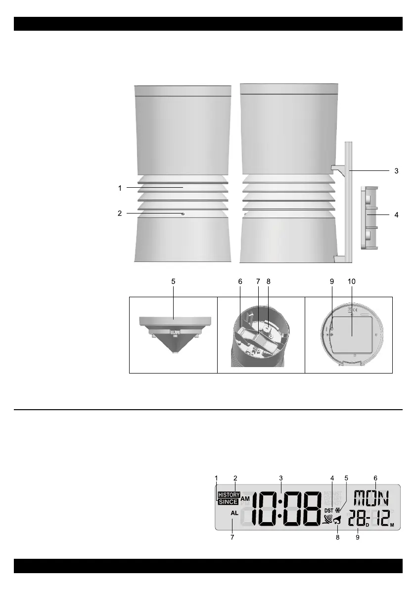 4. [ TOTAL ]: display total rainfall and the start day; hold to clear previous rainfall start time and