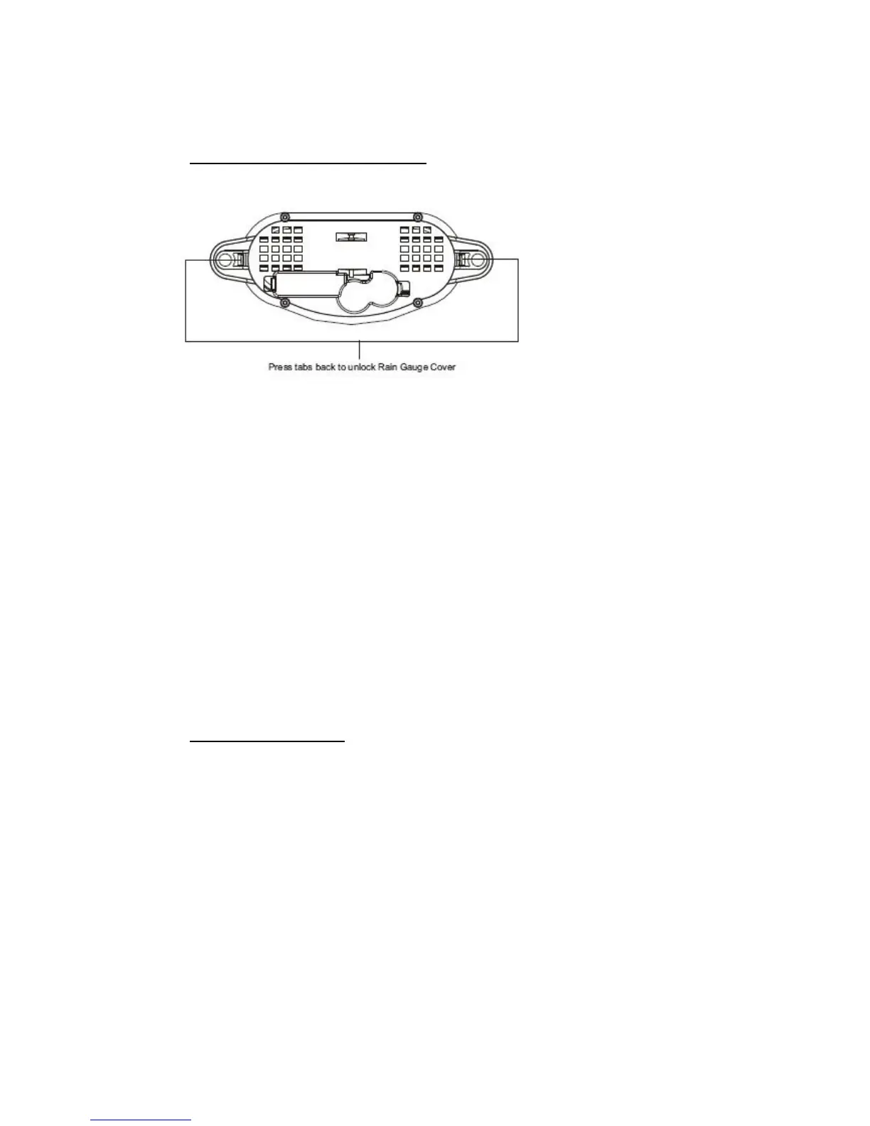 1. Press the tabs back as indicated below to unlock the rain gauge cover