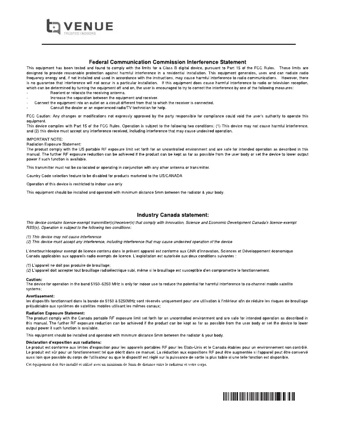 Venue Tag - Regulatory Compliance Statements; FCC Interference Statement; FCC Radiation Exposure; Industry Canada Statement