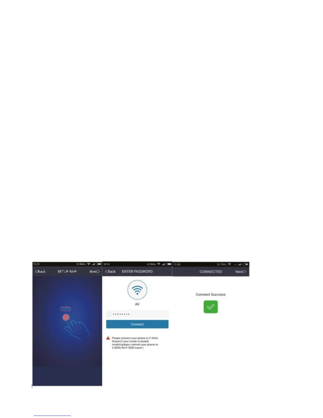 hearing voice prompt ”WIFI searching”, then Press "Next" on the APP and enter router password.