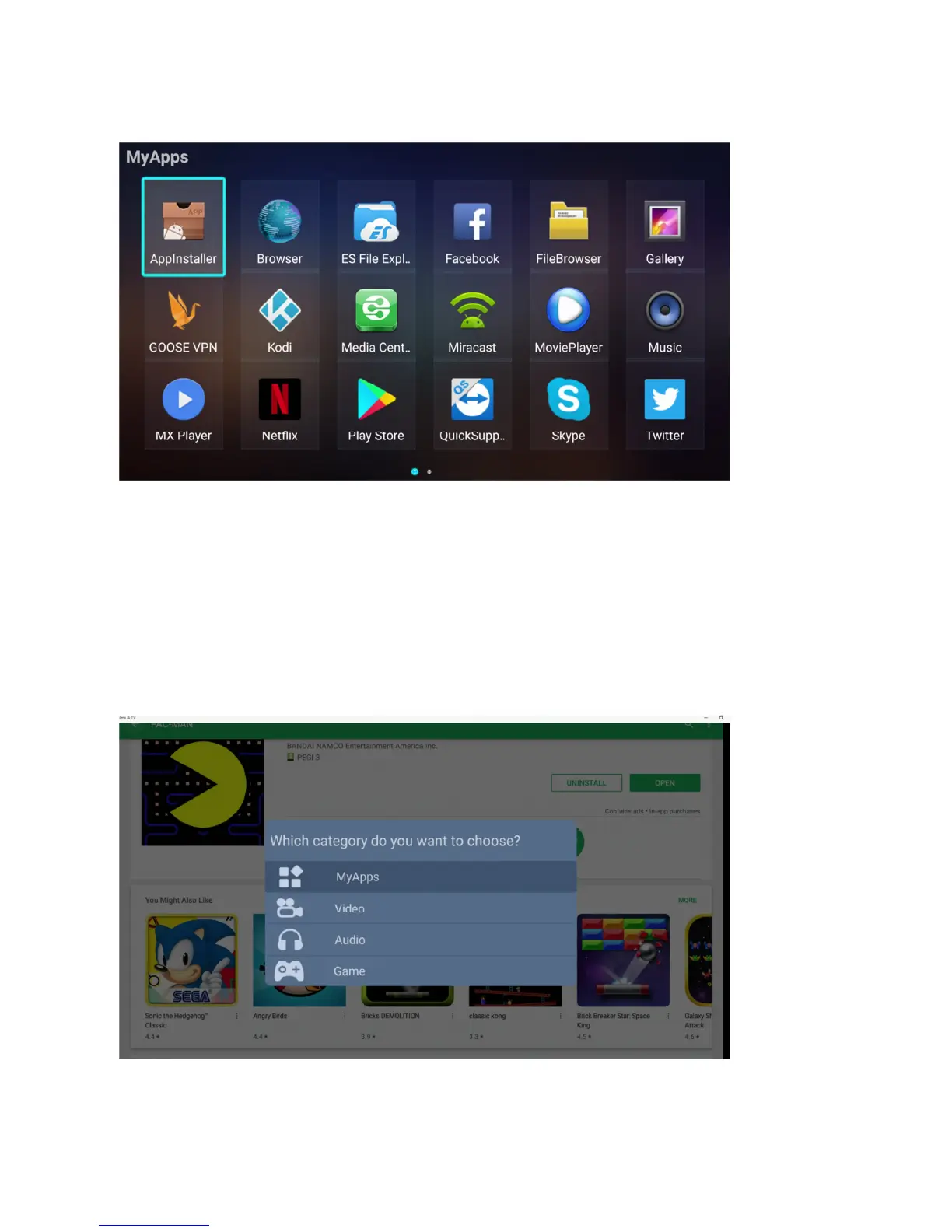 My Apps – Video – Audio – Games. Once selected the installed app will appear in the folder of choice