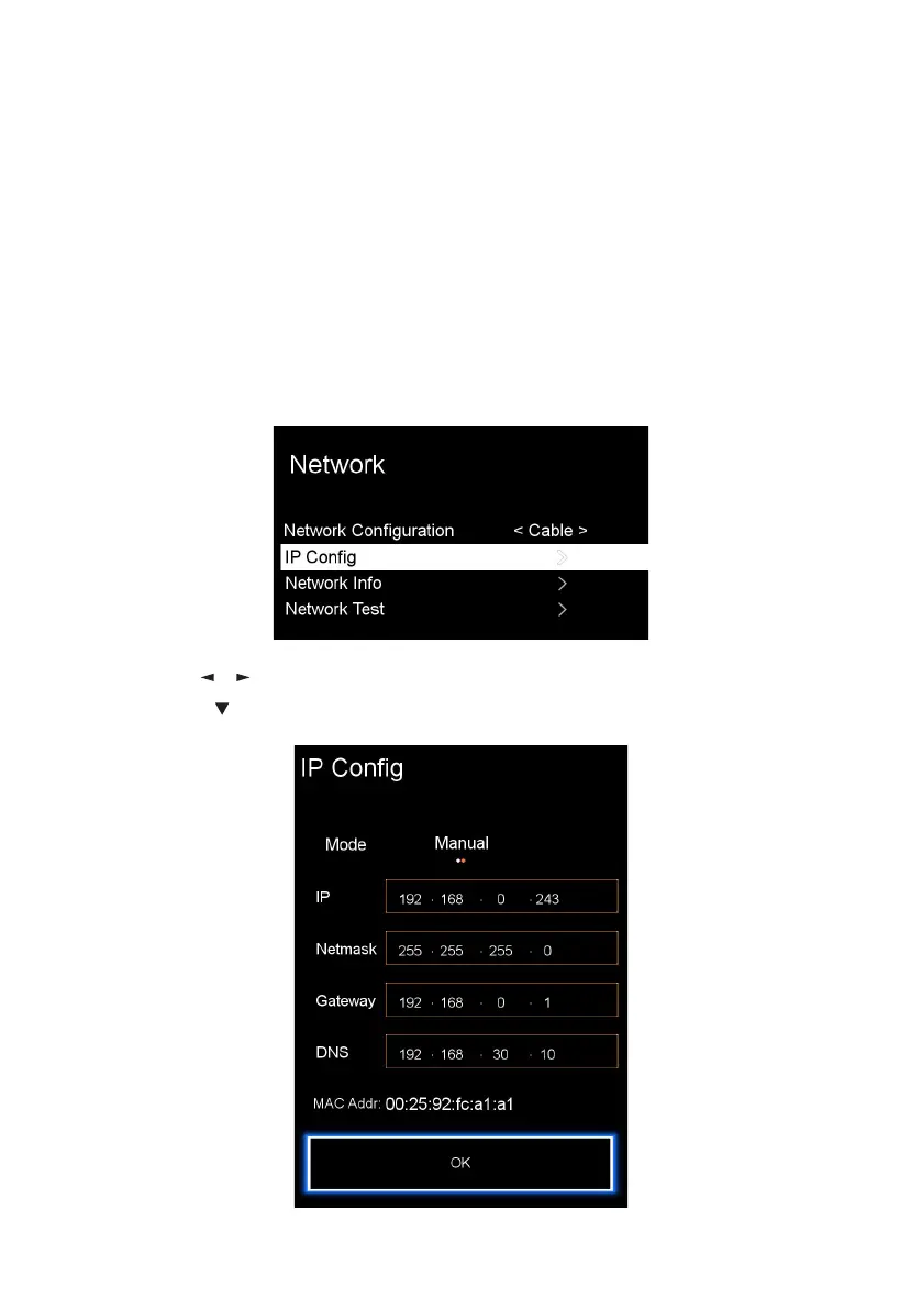 • Then press to highlight “IP Config”, next press OK and the bellow screen