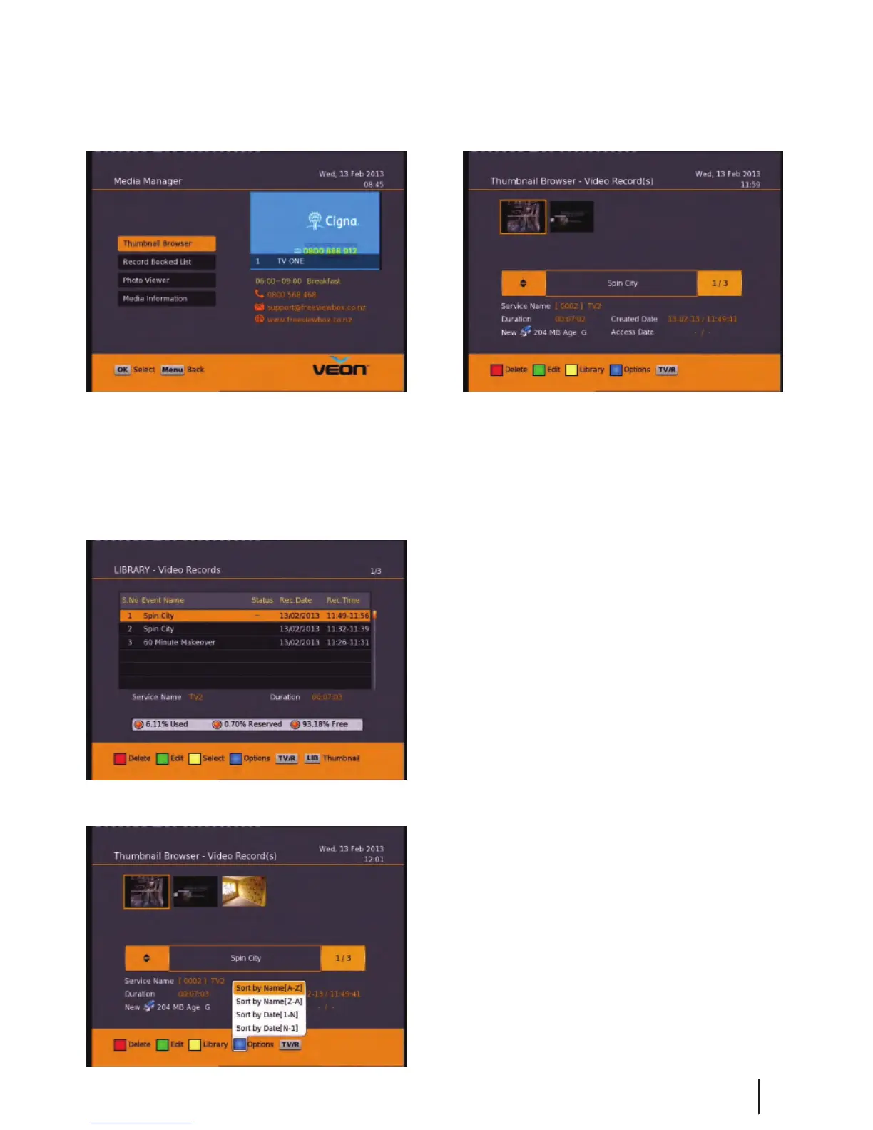 Here you can browse through your recorded programs as thumbnails, the title and information for your