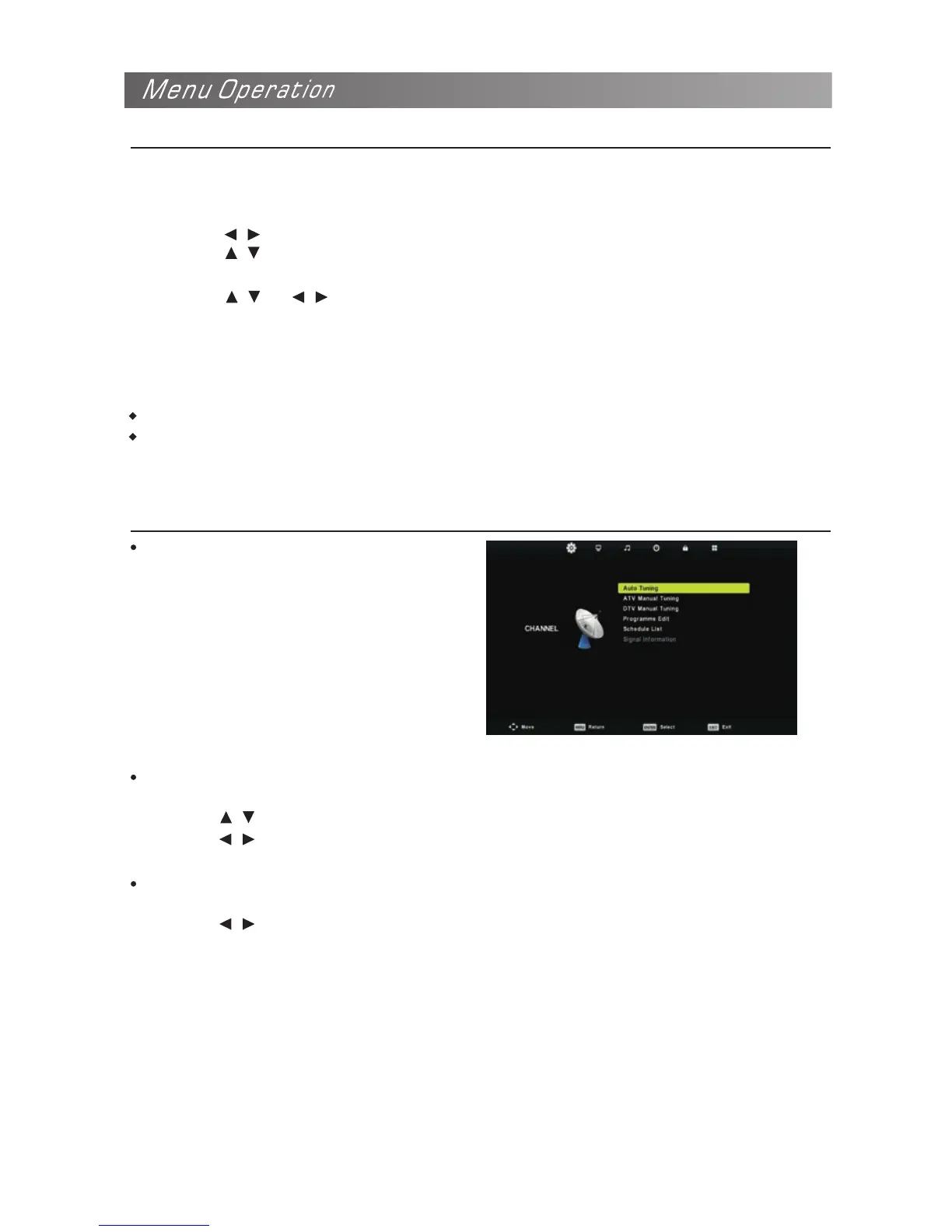 remote control is lost or couldn’t work, you may use the buttons on the TV to select menus. This manual