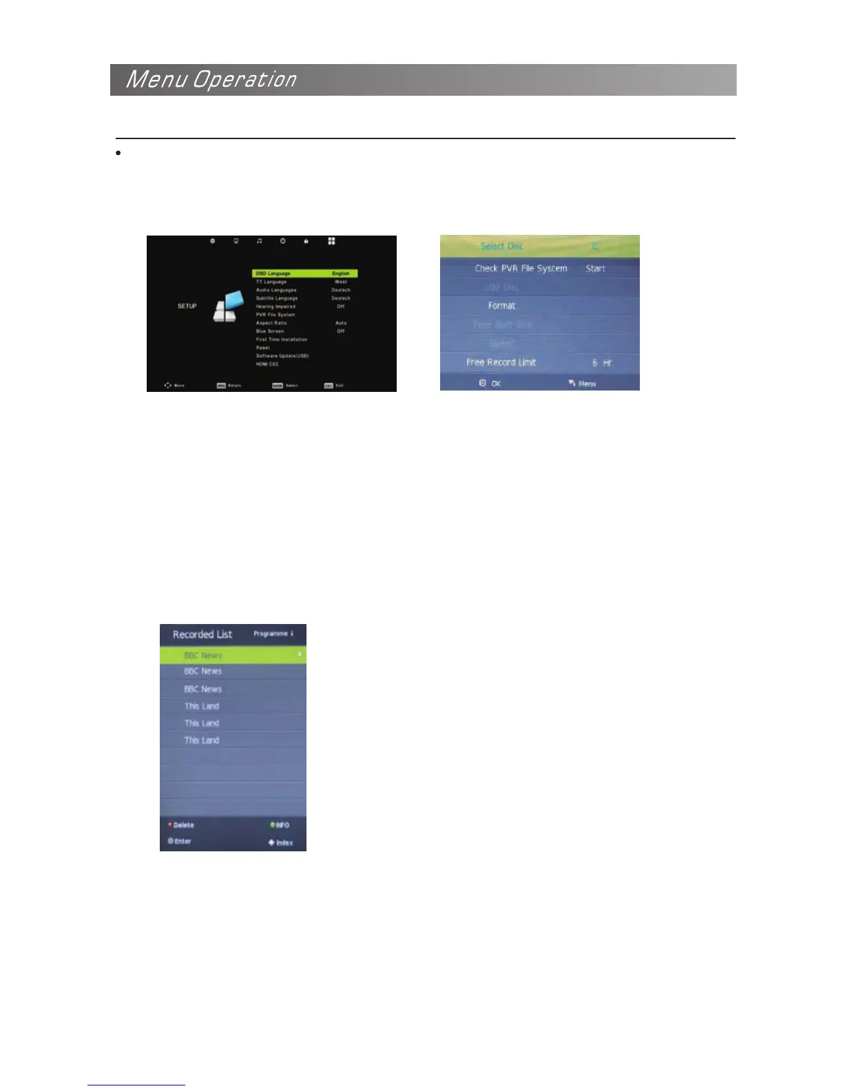 Press the MENU button, select SETUP menu, and select “PVR File System” , then press OK button