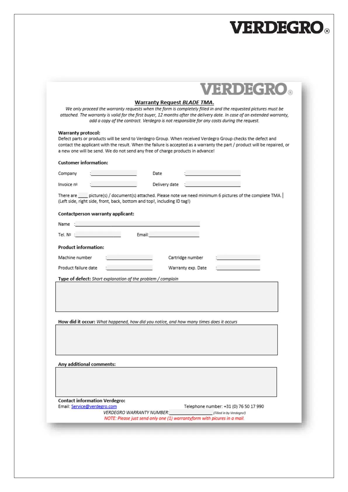 VERDEGRO Blade - Warranty Request Form; How to Submit a Warranty Claim