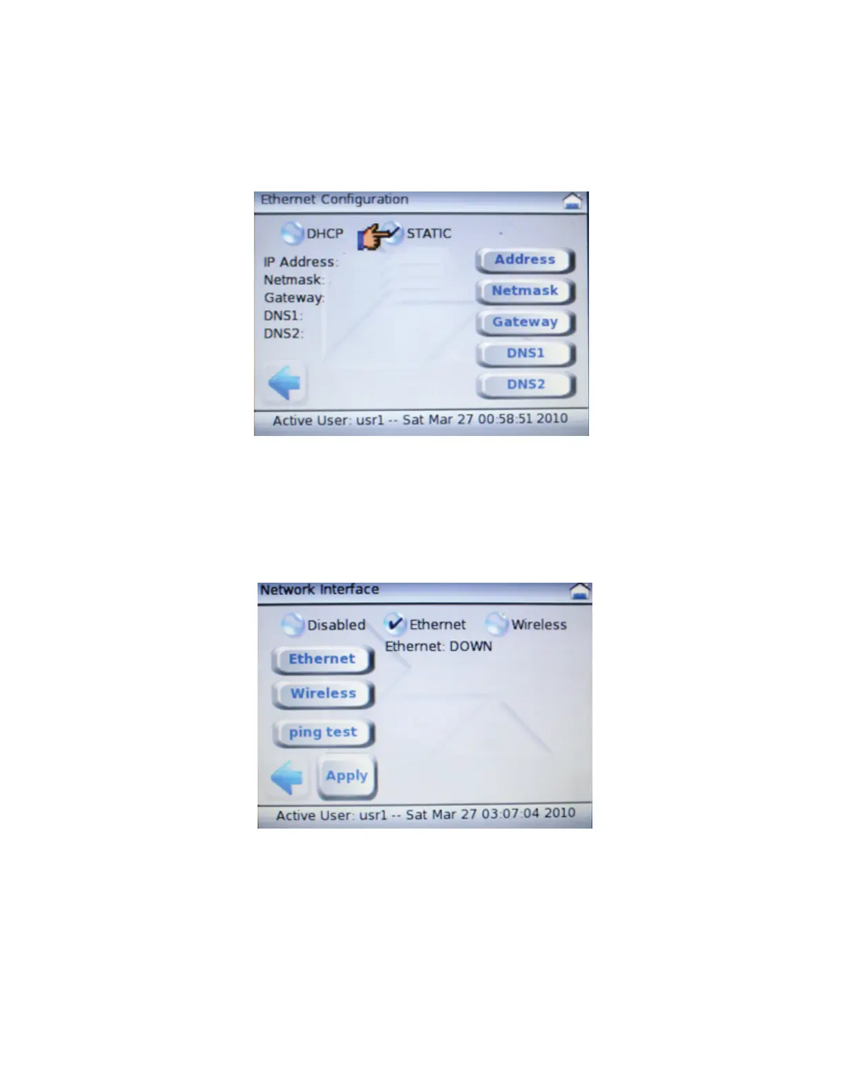 4. From the Ethernet Configuration menu, select the STATIC round button, and then select the