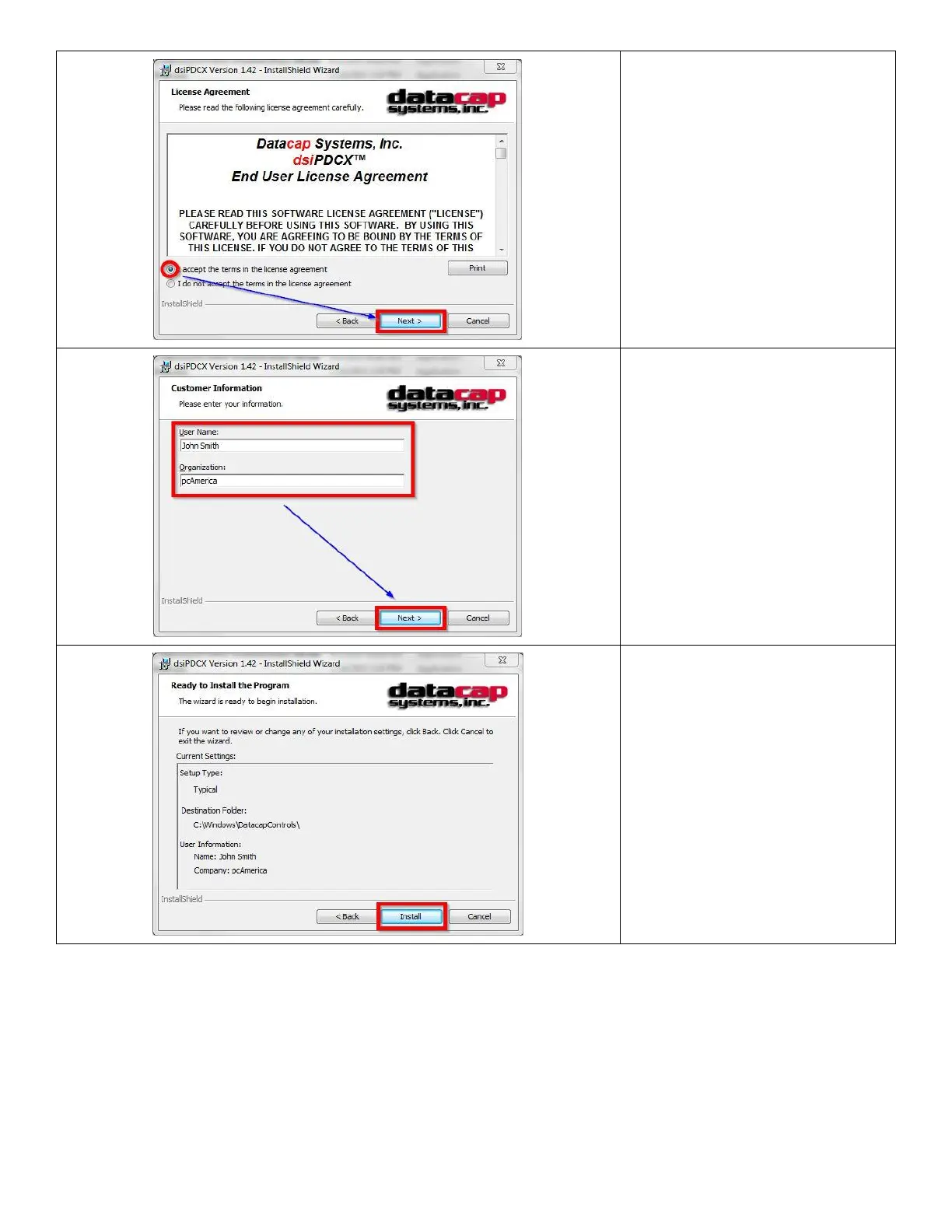 VeriFone VX 805 - Accept dsiPDCX License; Enter Installation Details; Start dsiPDCX Installation