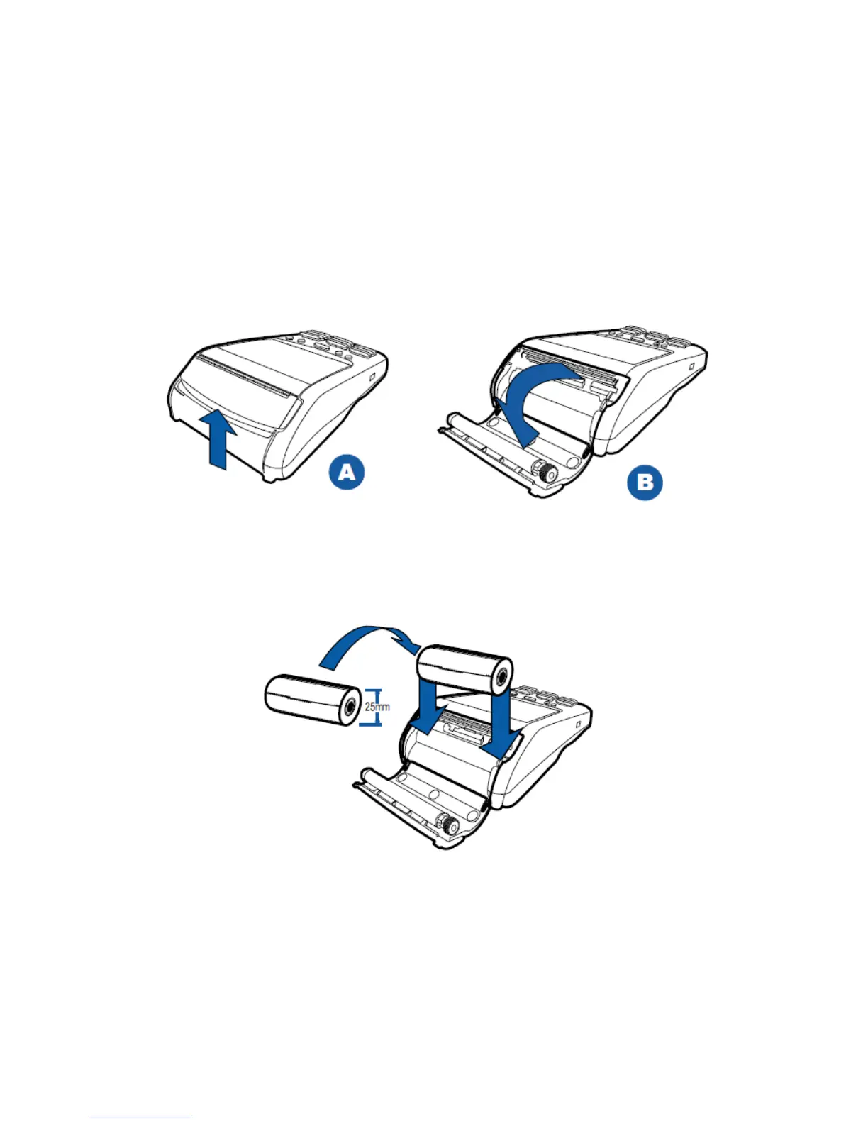 2. Lift the printer cover up and back (B) taking care not to dislodge the printer roller.