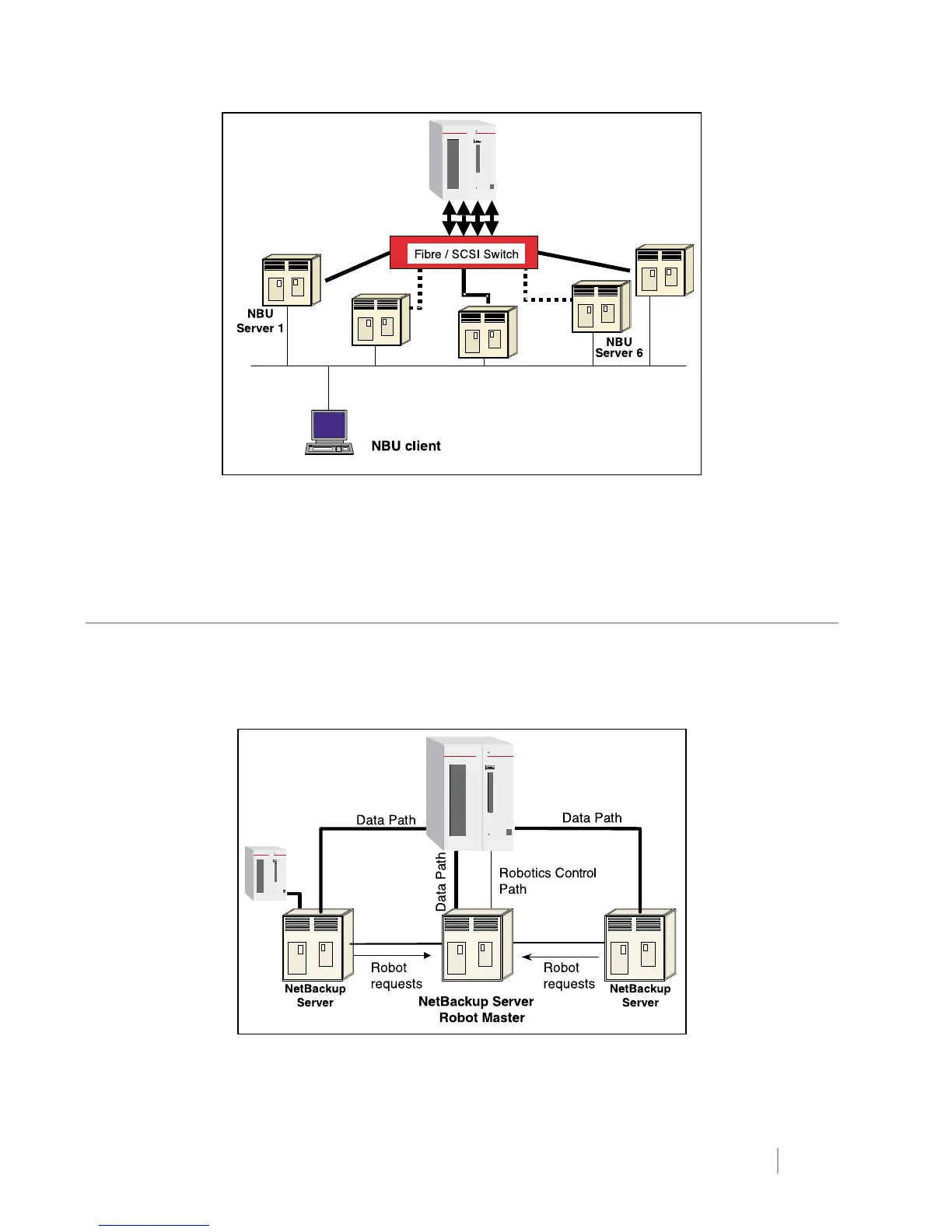tape library. One NetBackup server acts as the “robotics controller,” and other NetBackup servers request tape mount and