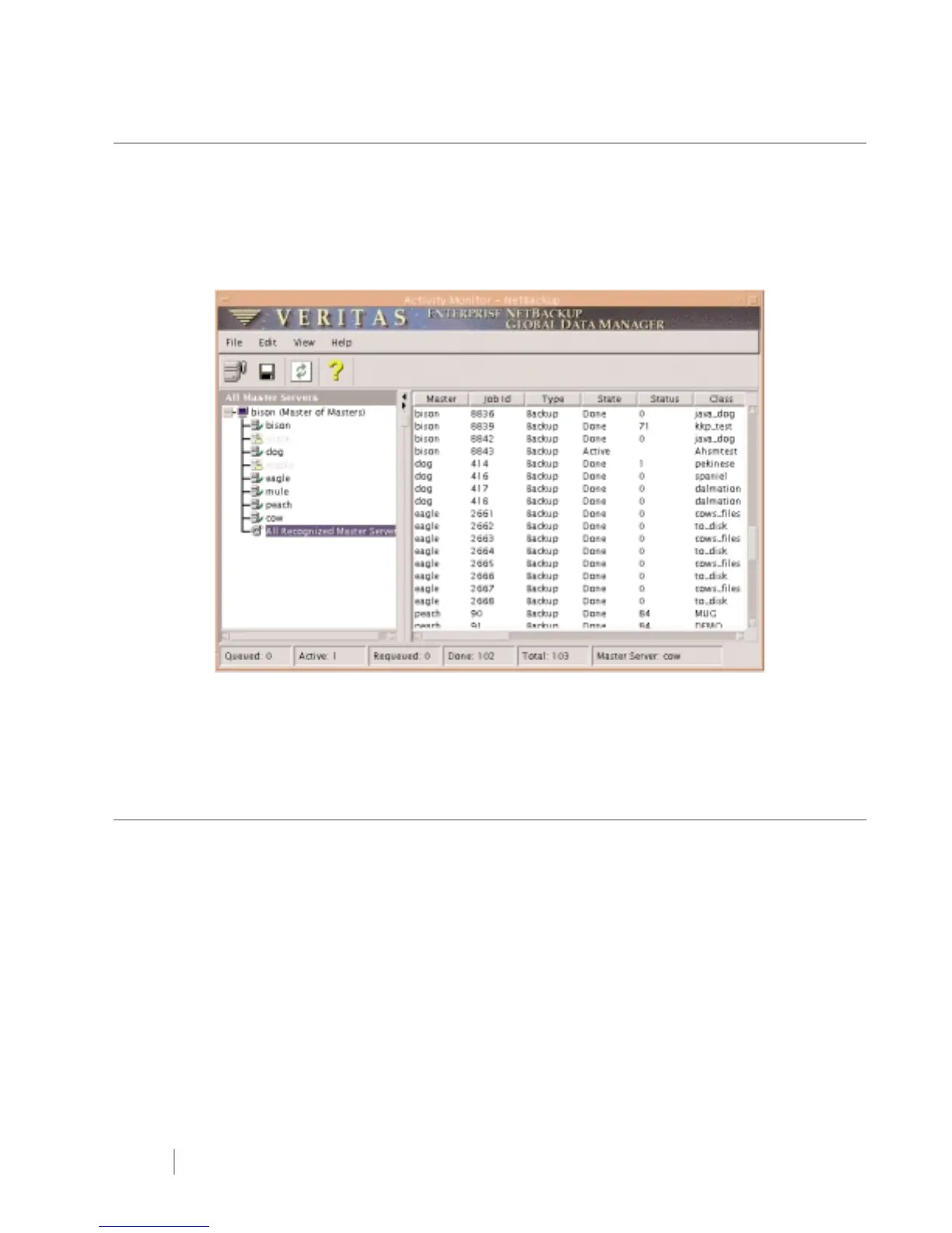 The VERITAS NetBackup Activity Monitor allows administrators to monitor progress and status of backup and archive jobs.