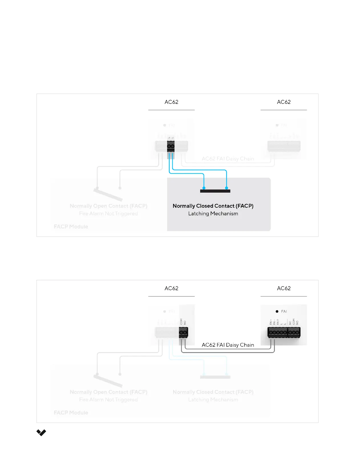 Two AC62 FAI may be daisy chained. The FAI and latching states from the