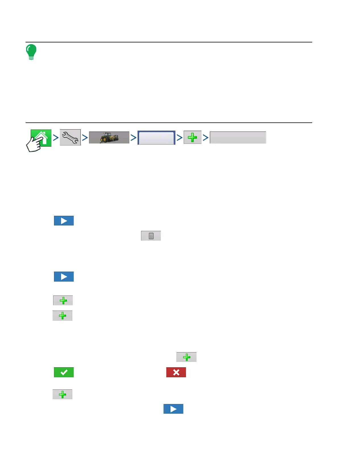 1. Press: Home button > Setup (wrench) button > Configuration (tractor) button > Product tab > Add (+)