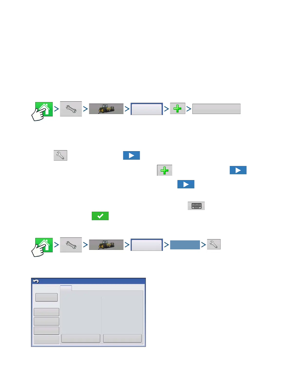 Press: Home button > Setup (wrench) button > Configuration (tractor) button > Configuration tab > Add