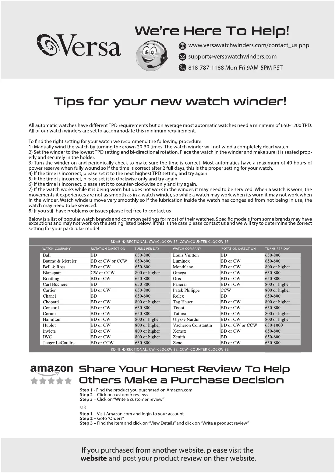 versa G084 - Watch Winder Usage Tips; TPD Setting Procedure; Troubleshooting Watch Winder Function