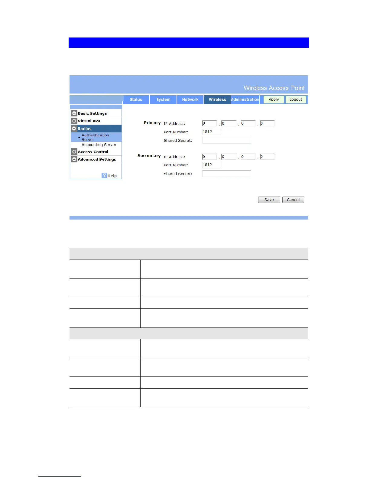 Clicking the Radius Server Settings link on the Wireless menu will result in a screen like the