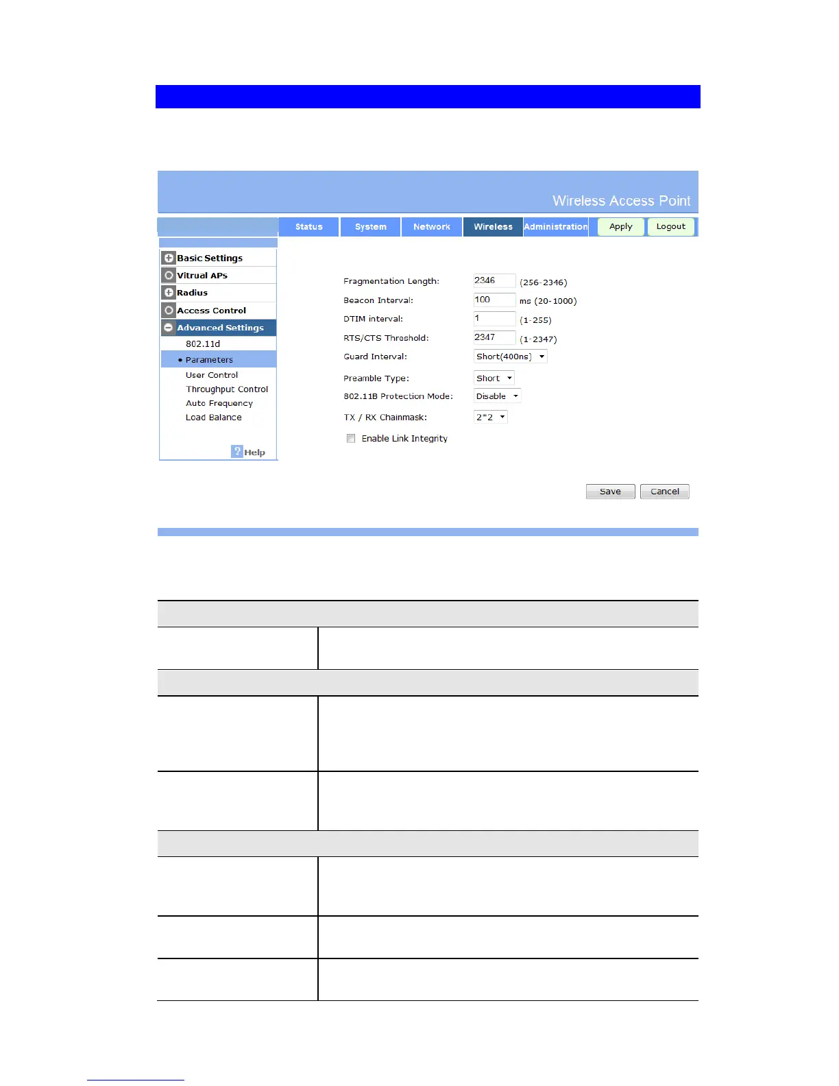 Clicking the Advanced Settings link on the Wireless menu will result in a screen like the