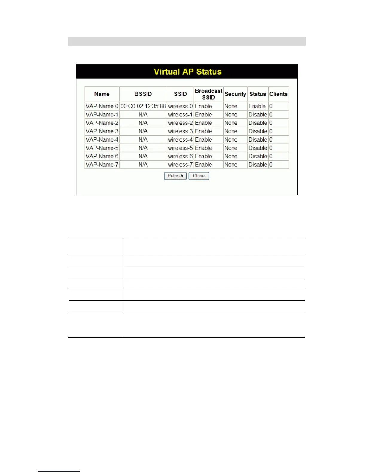 This screen is displayed when the Virtual AP Status button on the Status screen is clicked.