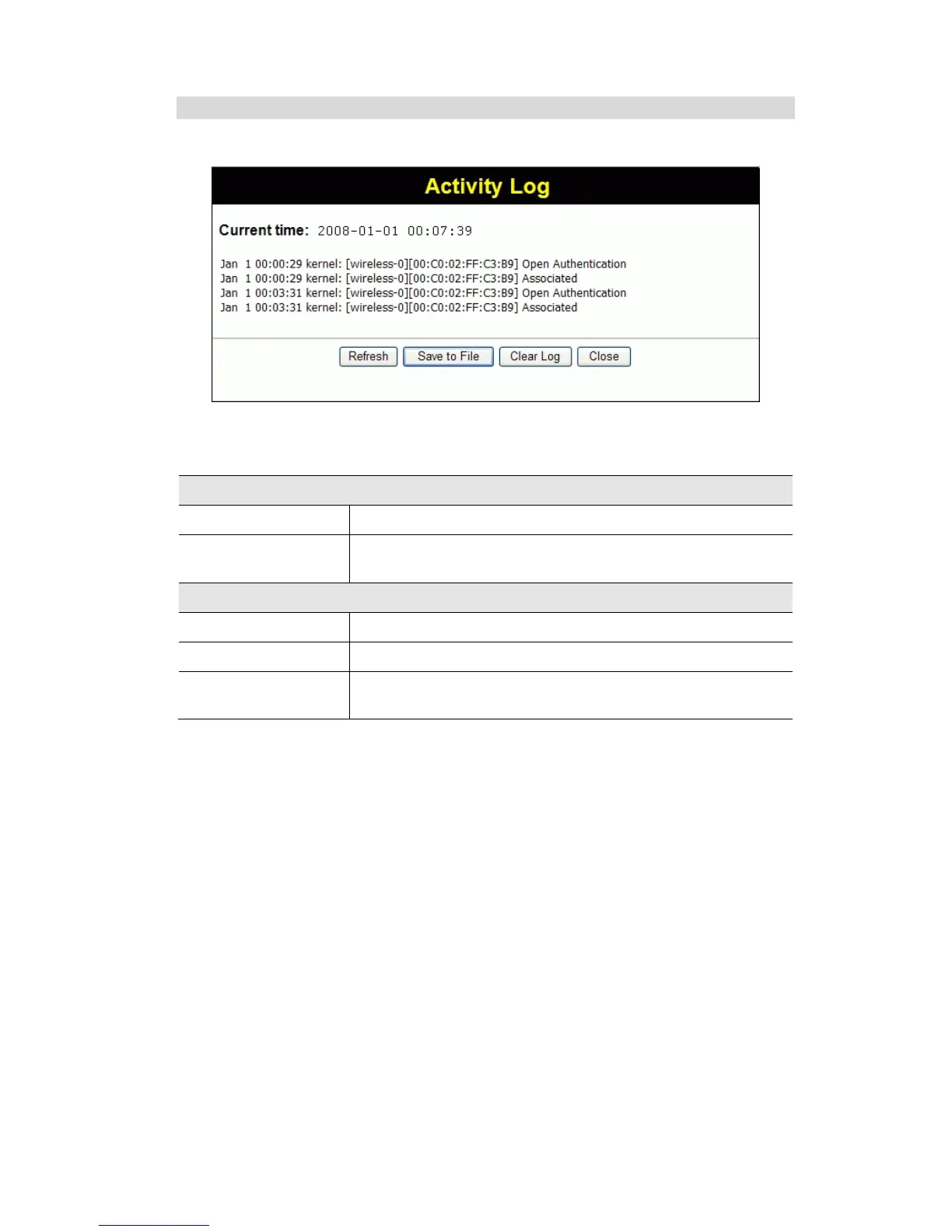 The Log shows details of the connections to the Wireless Access