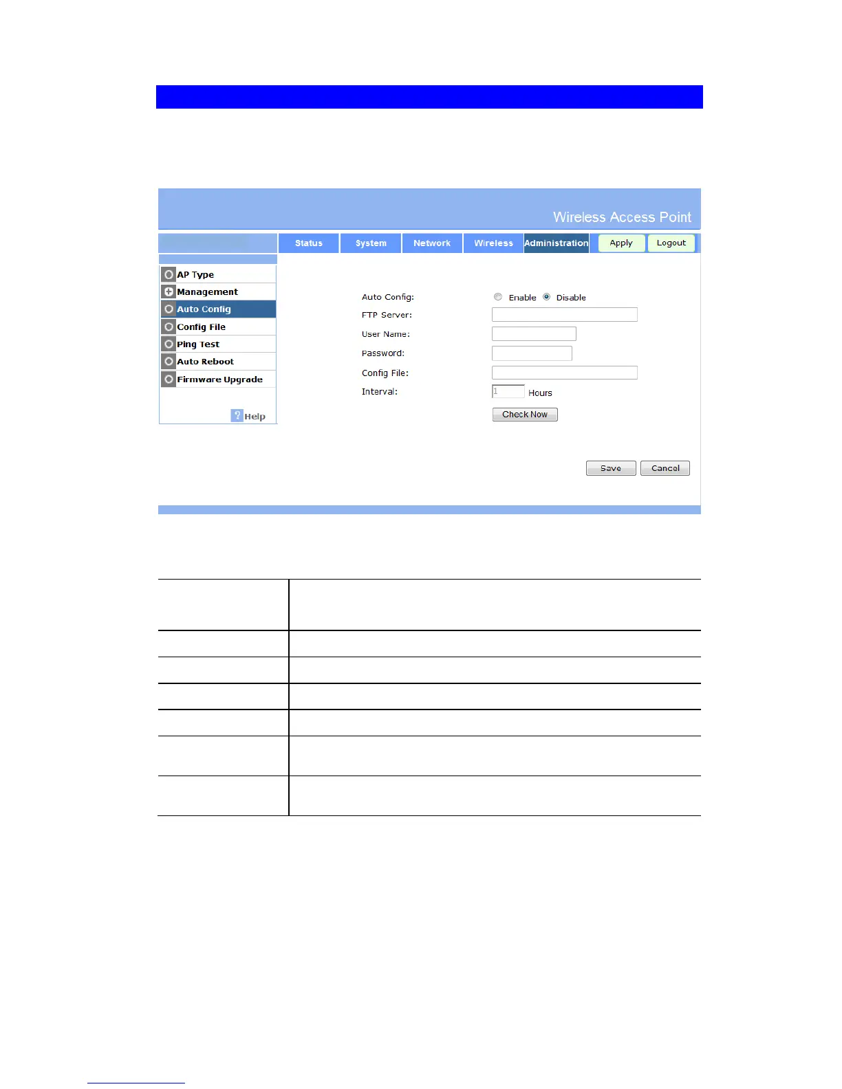 load the config file from the FTP Server. To reach this screen, select Auto Config in the Ad-