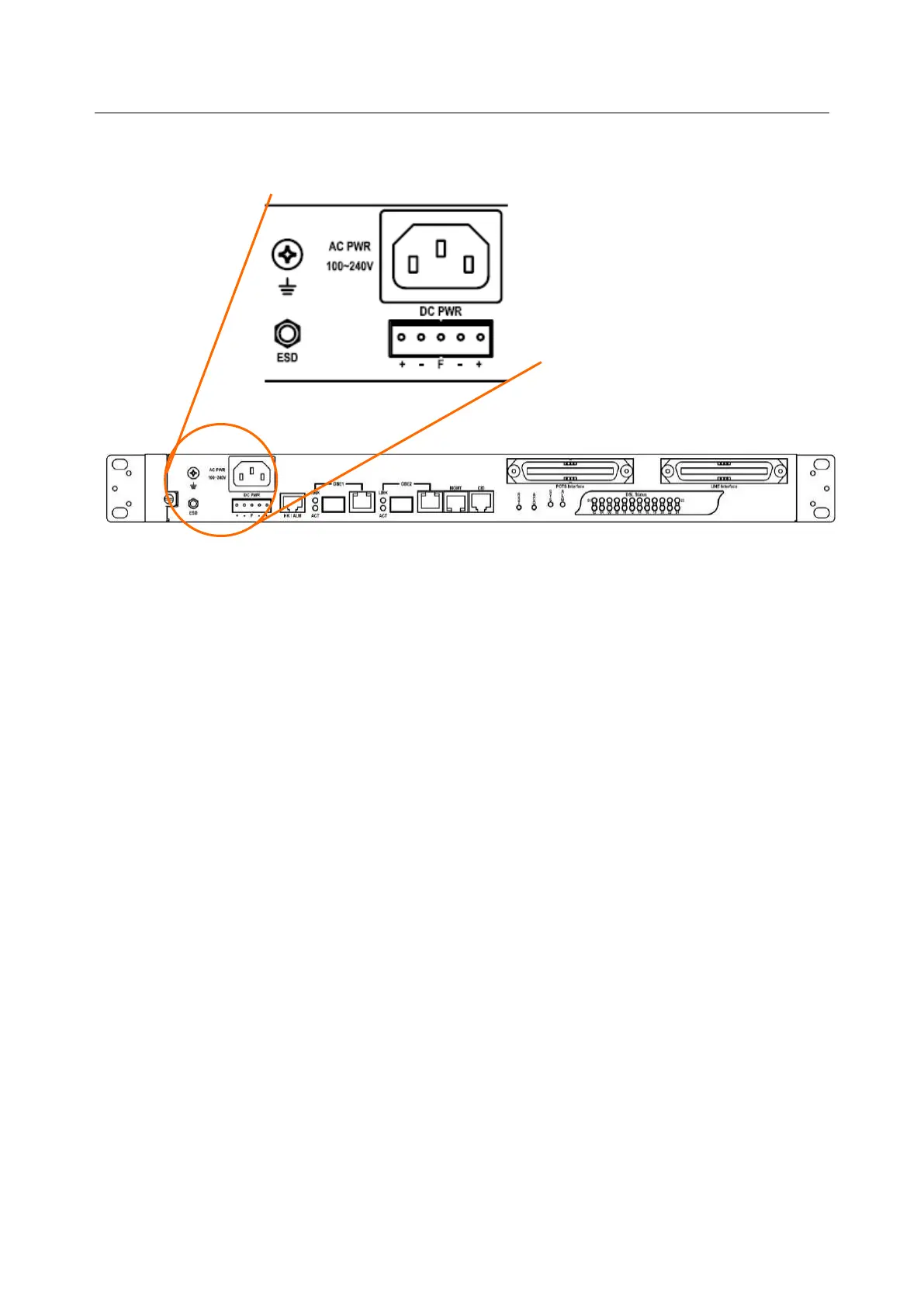 front panel of the DSLAM (refer to Figure 1-8), and plug the cord into the external power source.
