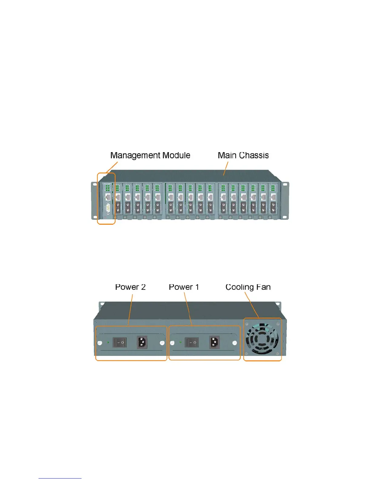 Main Chassis: provides insertion slots on front panel for CPU management module and optional add-on media
