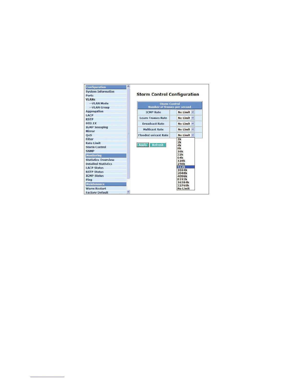 To enable the Multicast Storm capability the User can use the drop-down menu to select